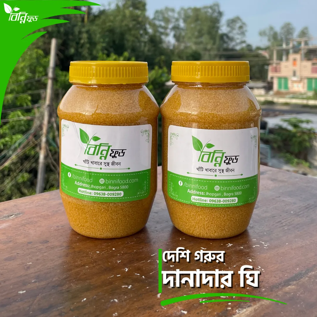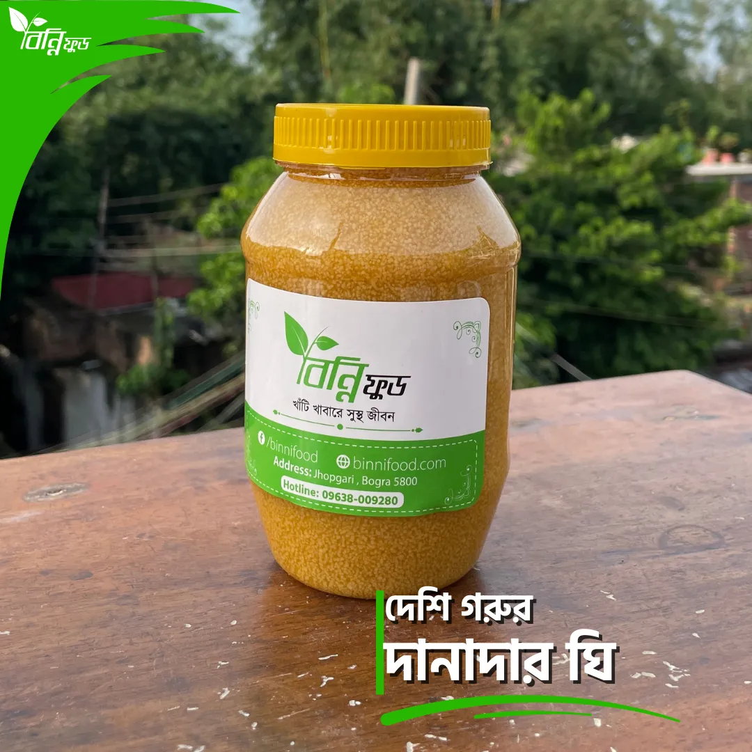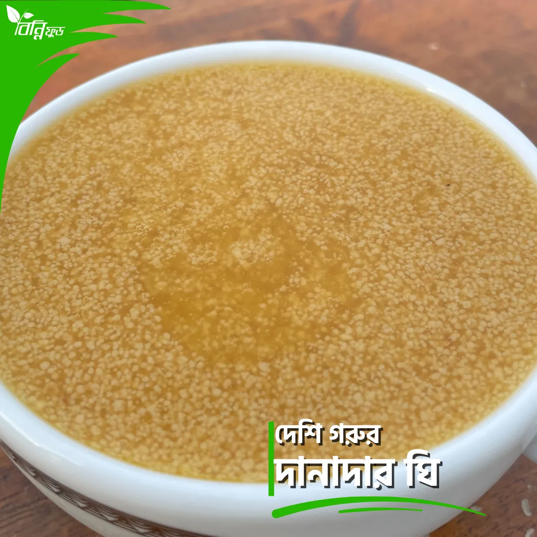 দেশি গরুর দানাদার গাওয়া ঘি, যা প্রাকৃতিকভাবে তৈরি হয়, সুস্বাদু এবং পুষ্টিকর। এই ঘি গরুর দুধ থেকে তৈরি হয় এবং এতে রয়েছে বিভিন্ন ভিটামিন ও খনিজ উপাদান। রান্নায় এই ঘিয়ের স্বাদ ও সুগন্ধ খাবারকে অনন্য করে তোলে। এটি স্বাস্থ্যসম্মত এবং বিভিন্ন ধরনের পদে ব্যবহারযোগ্য।